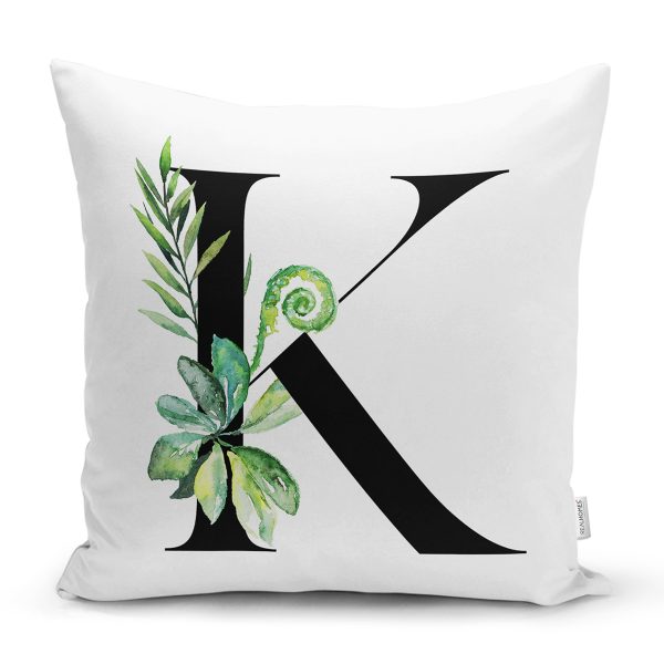 Beyaz Zemin Yaprak Motifli Siyah K Harfi Özel Tasarım Dijital Baskılı Yastık Kırlent Kılıfı