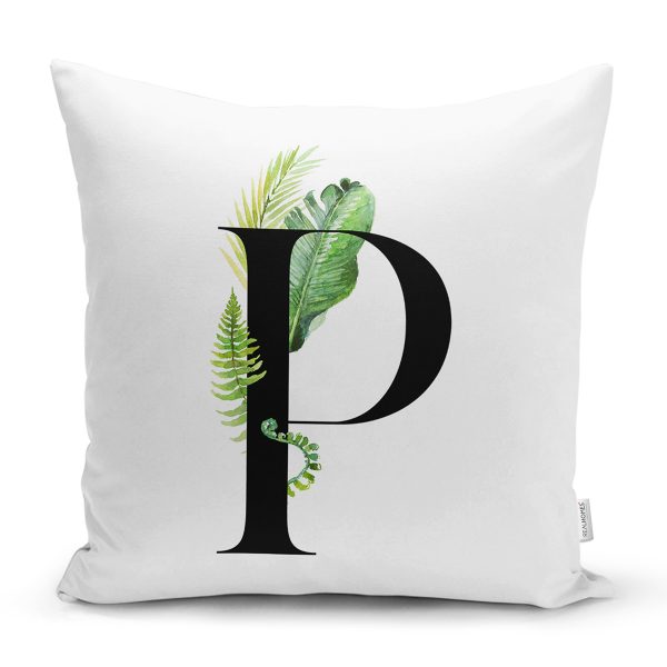 Beyaz Zemin Yaprak Motifli Siyah P Harfi Özel Tasarım Dijital Baskılı Yastık Kırlent Kılıfı