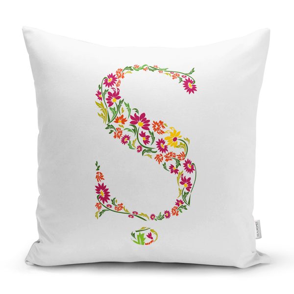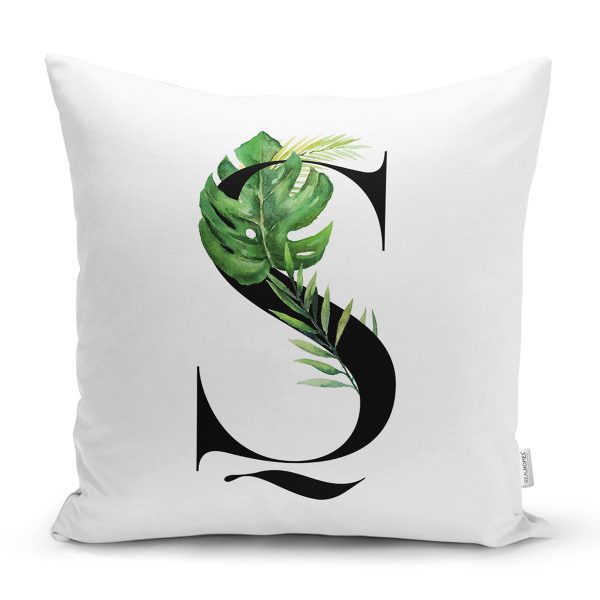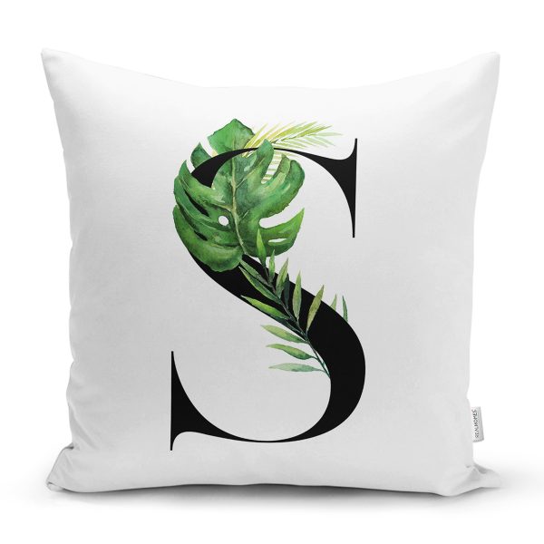 Beyaz Zemin Yaprak Motifli Siyah S Harfi Özel Tasarım Dijital Baskılı Yastık Kırlent Kılıfı