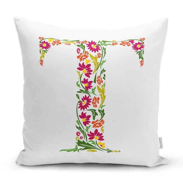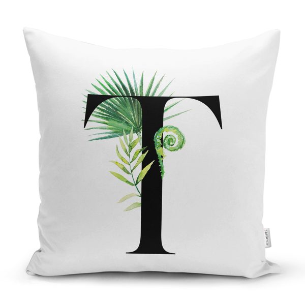 Beyaz Zemin Yaprak Temalı T Harfi Özel Tasarım Dijital Baskılı Yastık Kırlent Kılıfı