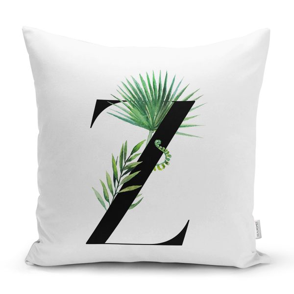 Beyaz Zemin Yaprak Motifli Siyah Z Harfi Özel Tasarım Dijital Baskılı Yastık Kırlent Kılıfı