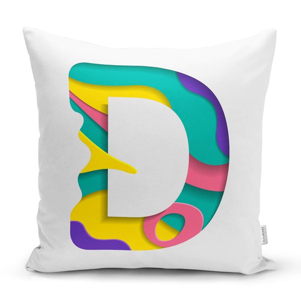 Beyaz Zemin Renkli D Harfli Özel Tasarım Dijital Baskılı Yastık Kırlent Kılıfı