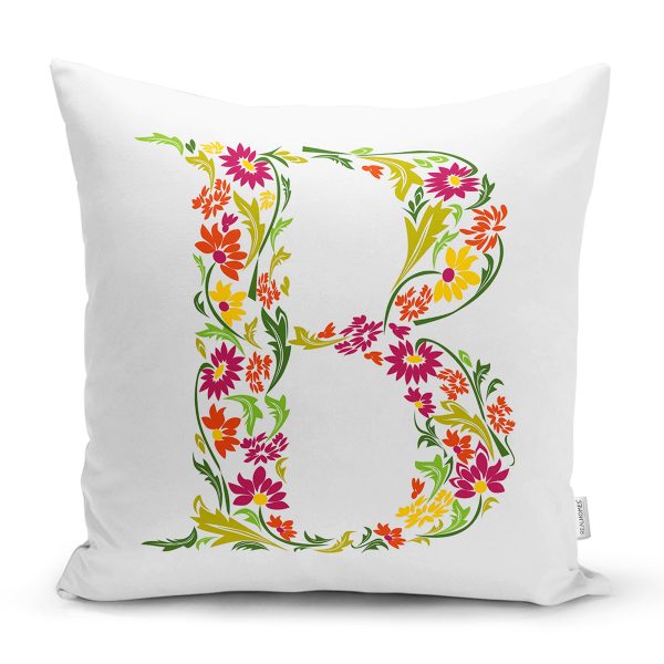 Beyaz Zemin Yaprak Temalı B Harfi Özel Tasarım Dijital Baskılı Yastık Kırlent Kılıfı