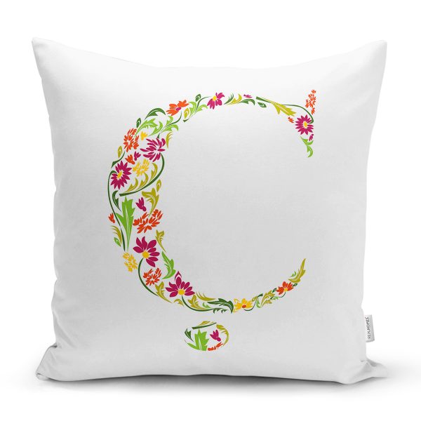 Beyaz Zemin Yaprak Temalı Ç Harfi Özel Tasarım Dijital Baskılı Yastık Kırlent Kılıfı