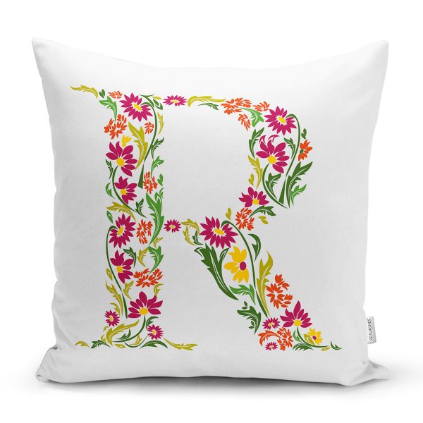 Beyaz Zemin Yaprak Temalı R Harfi Özel Tasarım Dijital Baskılı Yastık Kırlent Kılıfı