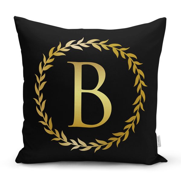 Siyah Zemin Gold Yaprak Çerçeveli B Harfi Özel Tasarım Dijital Baskılı Yastık Kırlent Kılıfı