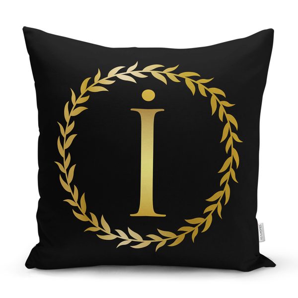 Siyah Zemin Gold Yaprak Çerçeveli İ Harfi Özel Tasarım Dijital Baskılı Yastık Kırlent Kılıfı