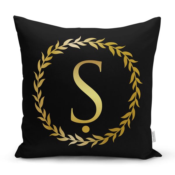 Siyah Zemin Gold Yaprak Çerçeveli Ş Harfi Özel Tasarım Dijital Baskılı Yastık Kırlent Kılıfı