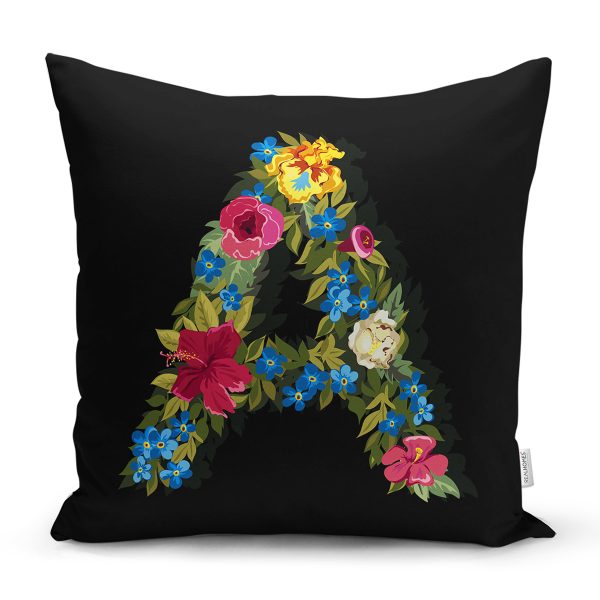 Siyah Zemin Renkli Gül Temalı A Harfi Özel Tasarım Dijital Baskılı Yastık Kırlent Kılıfı