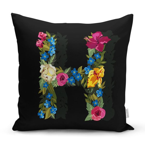 Siyah Zemin Renkli Gül Temalı H Harfi Özel Tasarım Dijital Baskılı Yastık Kırlent Kılıfı