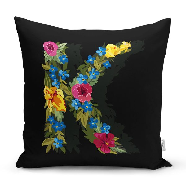Siyah Zemin Renkli Gül Temalı K Harfi Özel Tasarım Dijital Baskılı Yastık Kırlent Kılıfı