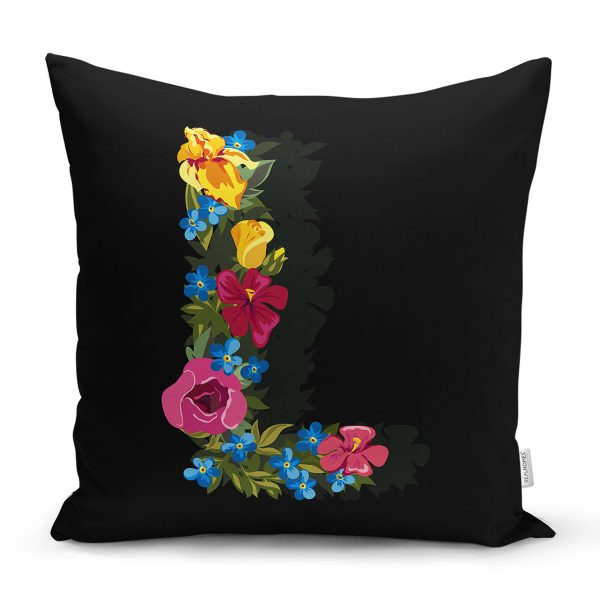 Siyah Zemin Renkli Gül Temalı L Harfi Özel Tasarım Dijital Baskılı Yastık Kırlent Kılıfı
