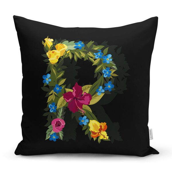 Siyah Zemin Renkli Gül Temalı R Harfi Özel Tasarım Dijital Baskılı Yastık Kırlent Kılıfı