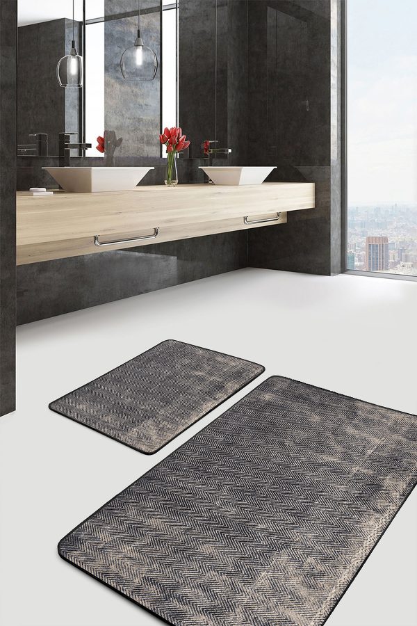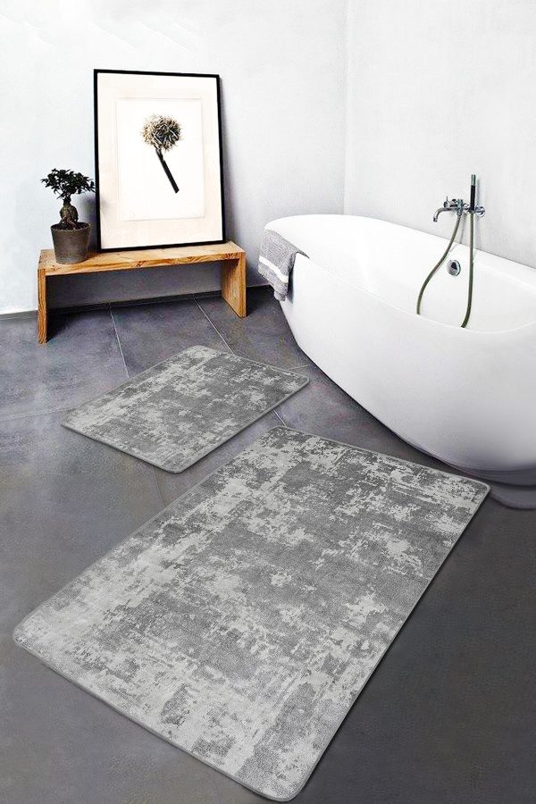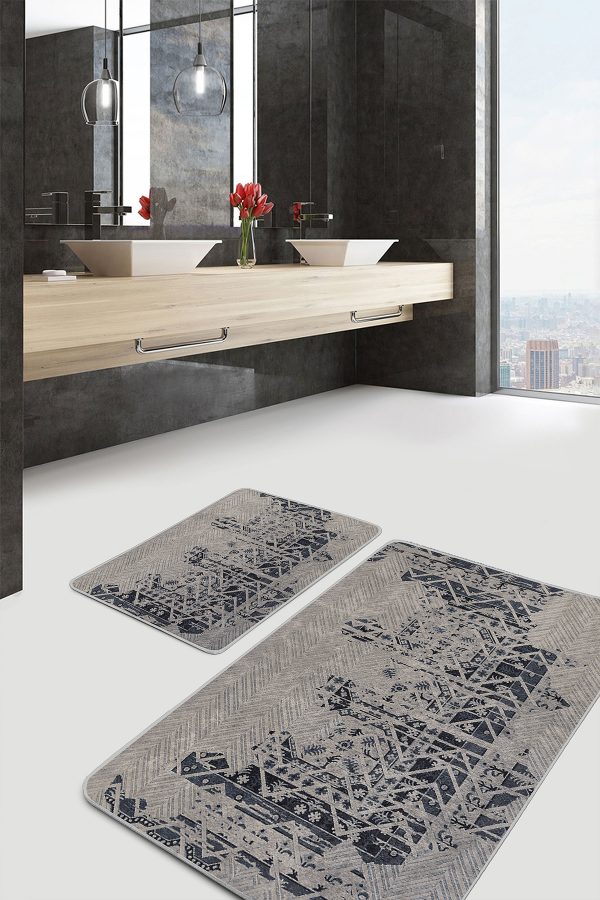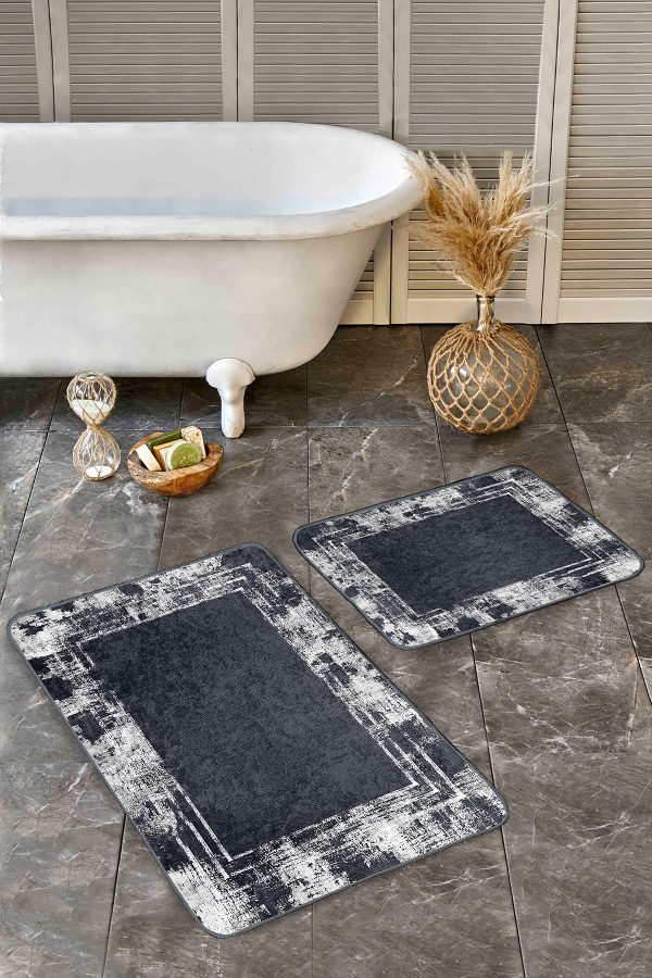 2’li Set Gri – Antrasit Zeminde Eskitme Motifli Antika Desenli Eskitme Motifli Vintage 2’li Banyo & Mutfak Paspas Takımı
