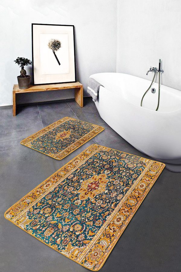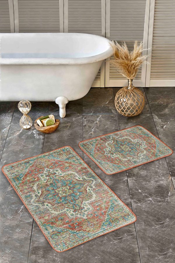 2’li Set Antika Zeminde Etnik Motifli Pers Desenli Eskitme Motifli Vintage 2’li Banyo & Mutfak Paspas Takımı