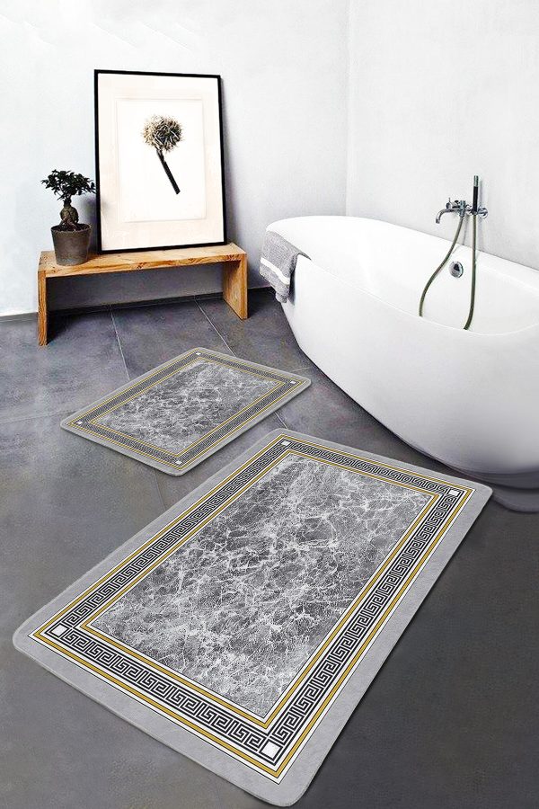 2’li Set Gold – Gri Zeminde Kanvas Motifli Mermer Desenli Sade & Şık Klasik 2’li Banyo & Mutfak Paspas Takımı