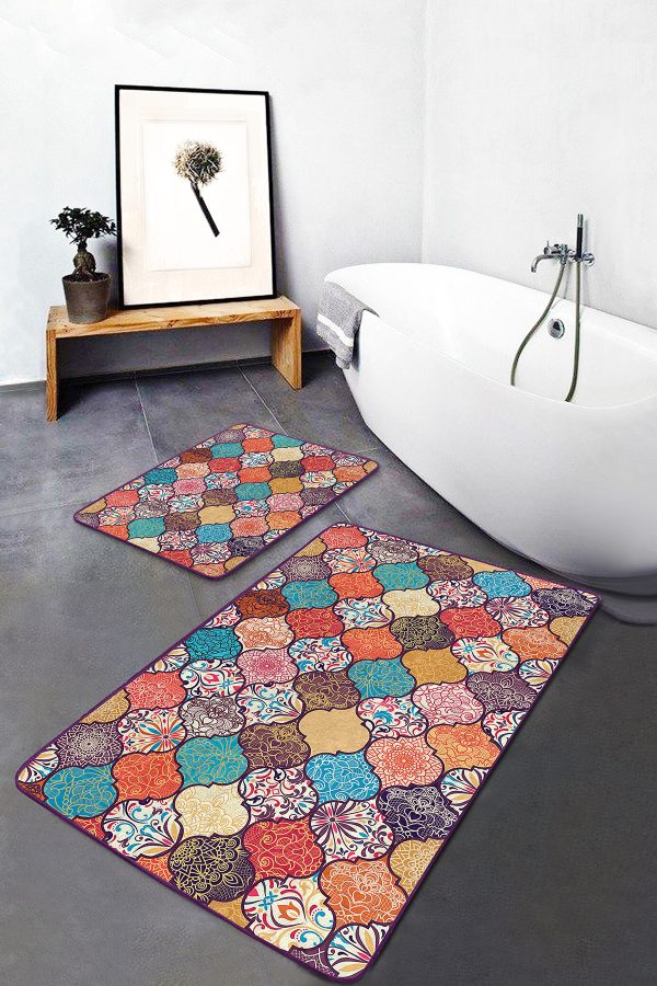 2’li Set Çok Renkli Zeminde Patchwork Motifli Geleneksel Desenli Geometrik Klasik 2’li Banyo & Mutfak Paspas Takımı