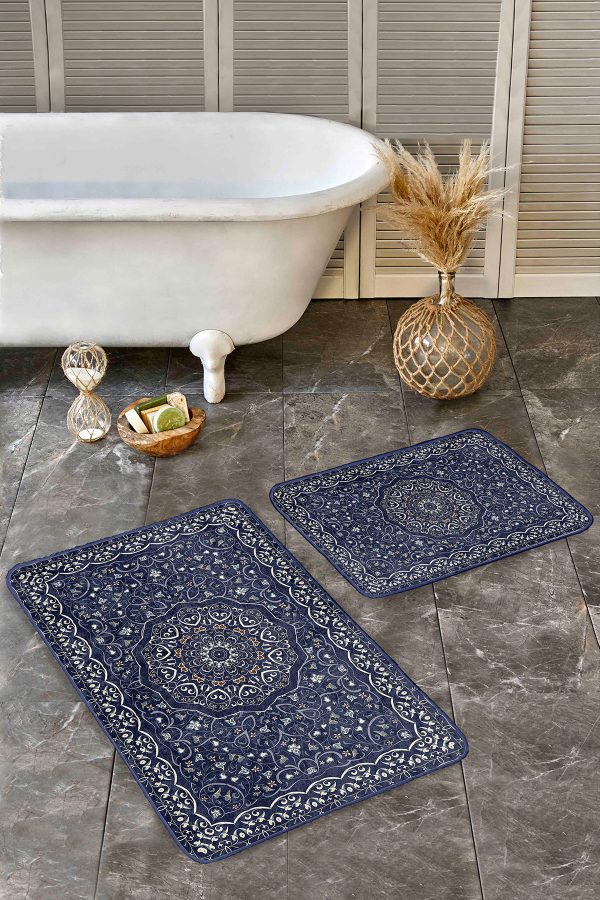 2’li Set Lacivert Zeminde Otantik Motifli Pers Desenli Etnik Motifler Vintage 2’li Banyo & Mutfak Paspas Takımı