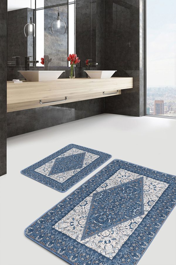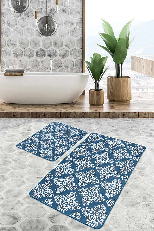 2’li Set Mavi Zeminde Etnik Motifli Damask Desenli Etnik Motifler Geometrik 2’li Banyo & Mutfak Paspas Takımı