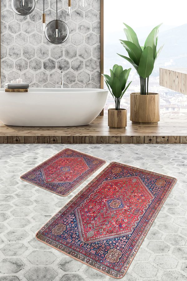 2’li Set Kırmızı Zeminde Türkmen Motifli Geleneksel Desenli Etnik Motifler Avangarde 2’li Banyo & Mutfak Paspas Takımı