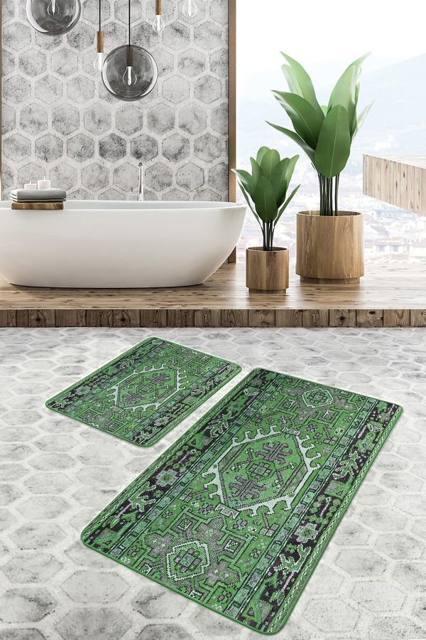 2’li Set Yeşil Zeminde Osmanlı Motifli Geleneksel Desenli Avangarde Vintage 2’li Banyo & Mutfak Paspas Takımı