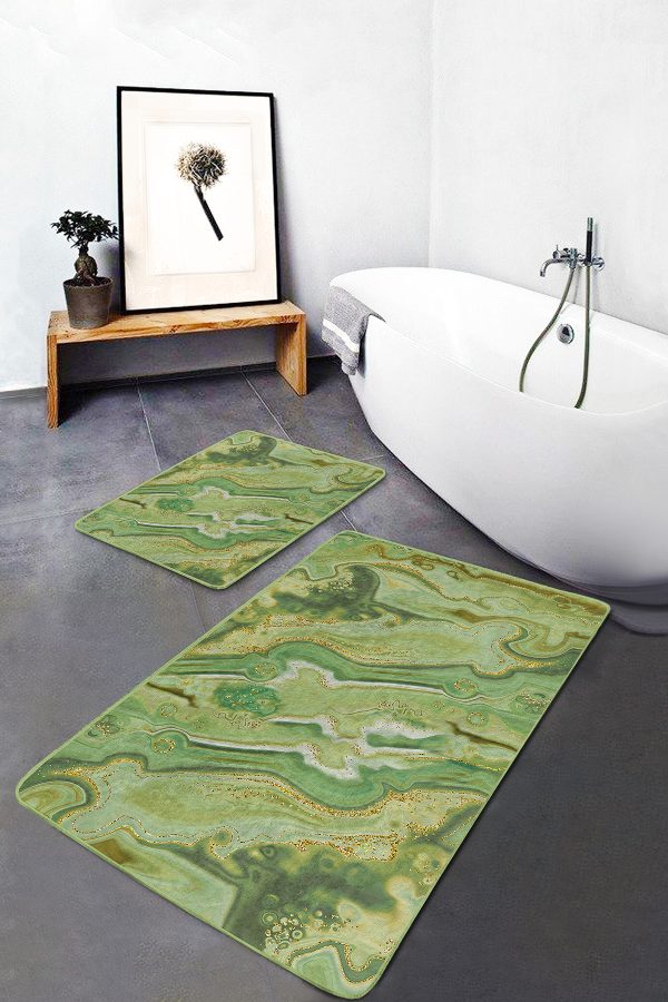 2’li Set Gold – Yeşil Zeminde Mermer Motifli Altın Desenli Modern Sade & Şık 2’li Banyo & Mutfak Paspas Takımı