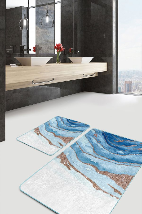 2’li Set Gold – Mavi Zeminde Mermer Motifli Kanvas Desenli Sade & Şık Modern 2’li Banyo & Mutfak Paspas Takımı
