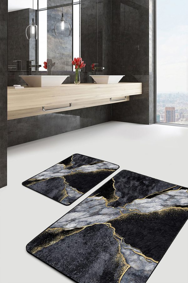2’li Set Gold – Siyah Zeminde Mermer Motifli Kanvas Desenli Modern Sade & Şık 2’li Banyo & Mutfak Paspas Takımı