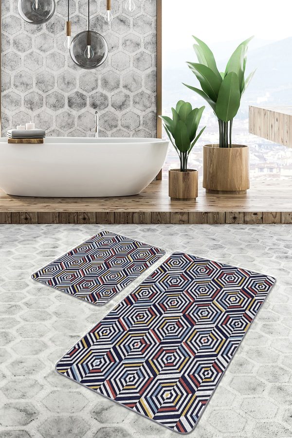 2’li Set Altıgen Zeminde Geometrik Motifli Modern Sanat Desenli Geometrik Klasik 2’li Banyo & Mutfak Paspas Takımı