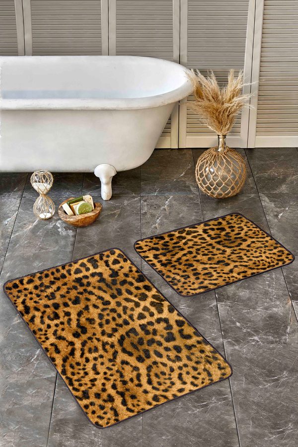 2’li Set Siyah – Turuncu Zeminde Leopar Motifli Kürk Desenli Sade & Şık Klasik 2’li Banyo & Mutfak Paspas Takımı