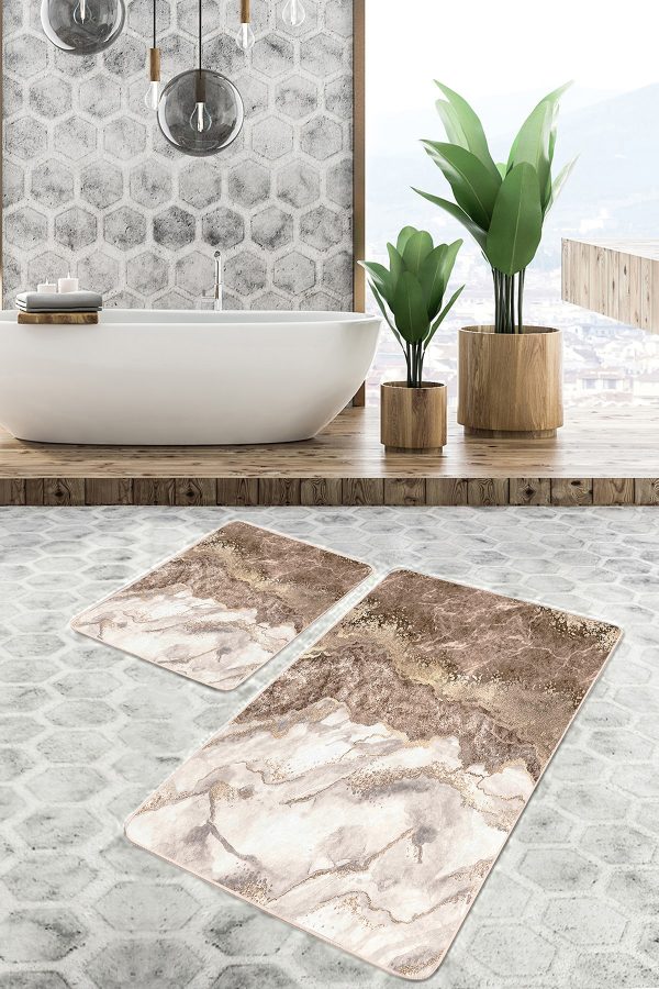 2’li Set Gold Zeminde Mermer Motifli Klasik Desenli Sade & Şık Klasik 2’li Banyo & Mutfak Paspas Takımı