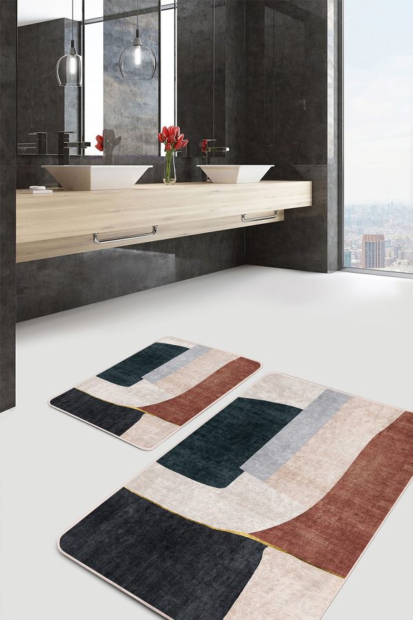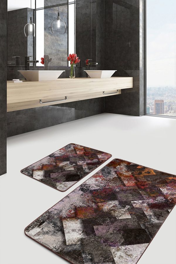 2’li Set Kahverengi Zeminde Çerçeveli Motifli Eskitme Desenli Geometrik Sade & Şık 2’li Banyo & Mutfak Paspas Takımı