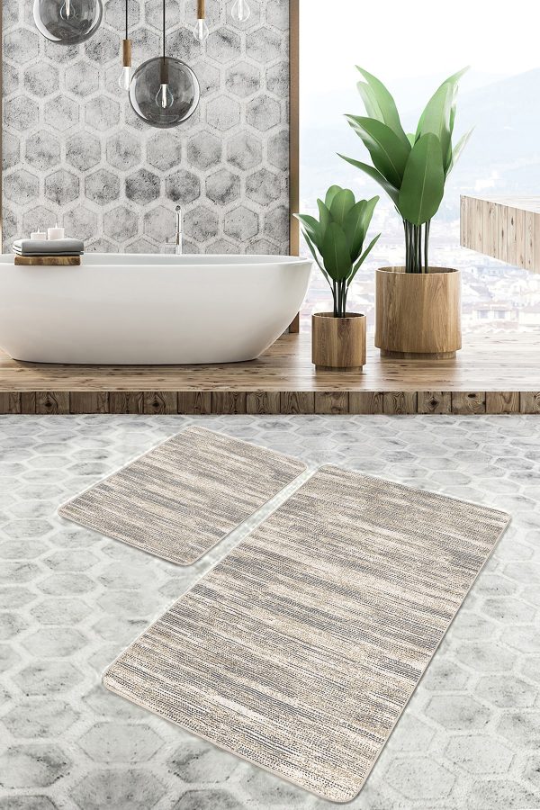 2’li Set Krem – Gri Zeminde Antik Motifli Geleneksel Desenli Eskitme Motifli Avangarde 2’li Banyo & Mutfak Paspas Takımı