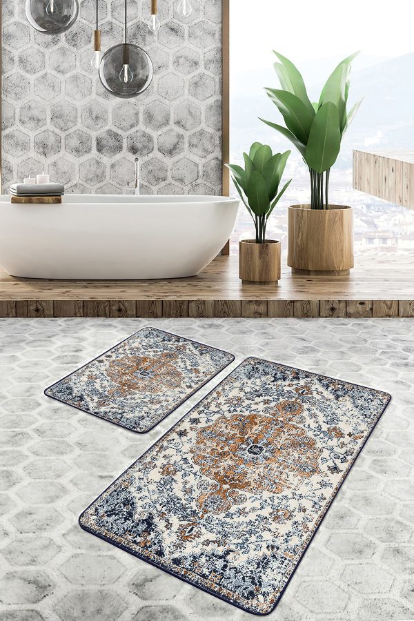 2’li Set Mavi – Krem Zeminde İran Motifli Dokuma Desenli Avangarde Vintage 2’li Banyo & Mutfak Paspas Takımı