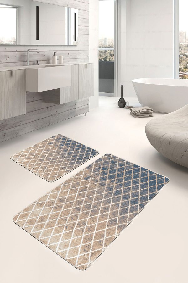 2’li Set Krem – Bej Zeminde Geometrik Motifli Klasik Desenli Eskitme Motifli Geometrik 2’li Banyo & Mutfak Paspas Takımı