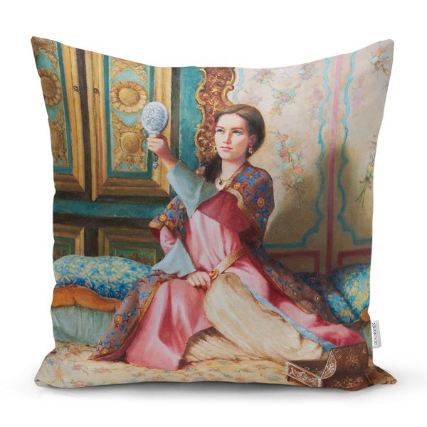 Eskitme Motifli Aynalı Kız Dijital Baskılı Yastık Kırlent Kılıfı