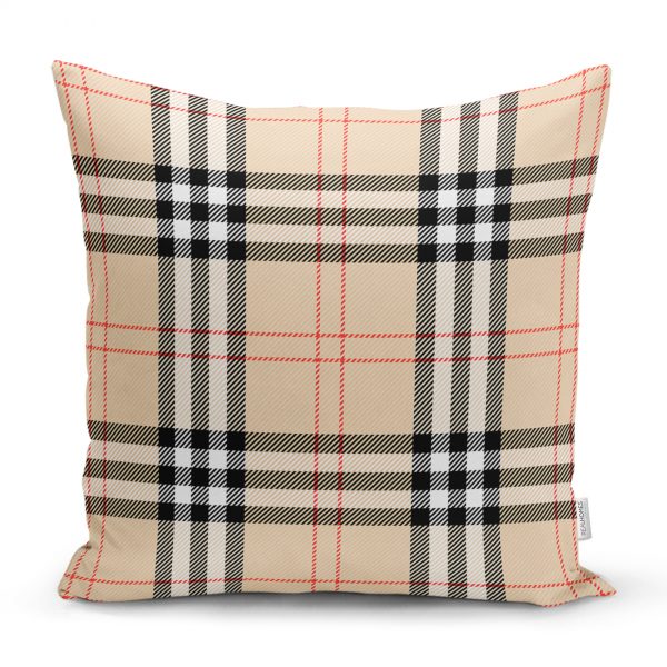 Krem Zeminli Ekose Desenli Dekoratif Yastık Kırlent Kılıfı