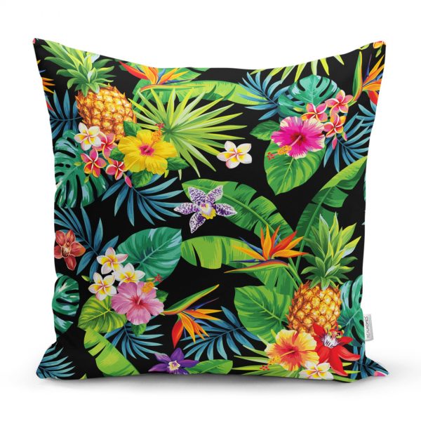 Siyah Zeminli Geometrik Yapraklar Desenli Yastık Kırlent Kılıfı
