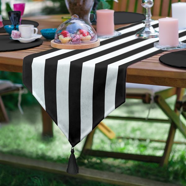 Realhomes Siyah Beyaz Çizgili Dekoratif Özel Tasarım Püsküllü Şönil Üçgen Runner