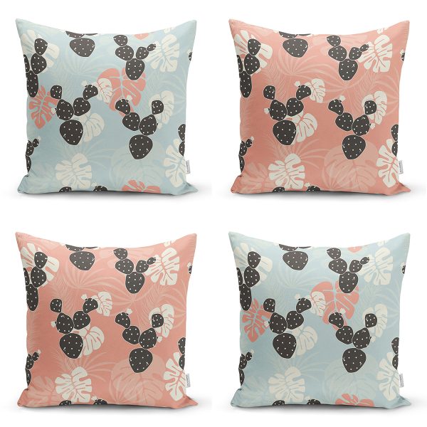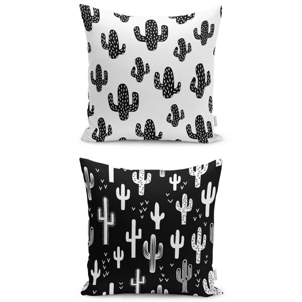 2’li Siyah Beyaz Kaktüs Çizimli Dijital Baskılı Yastık Kırlent Kılıf Seti
