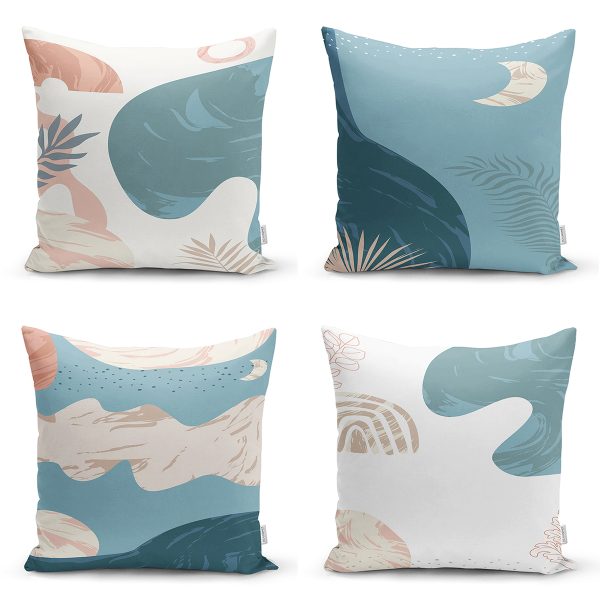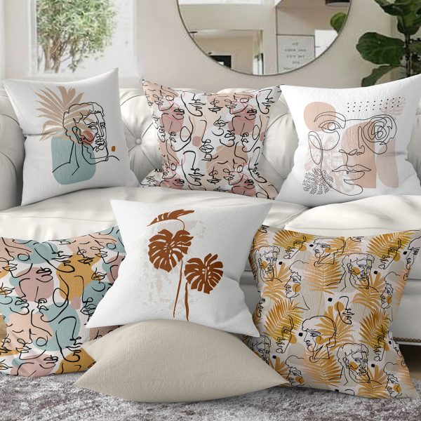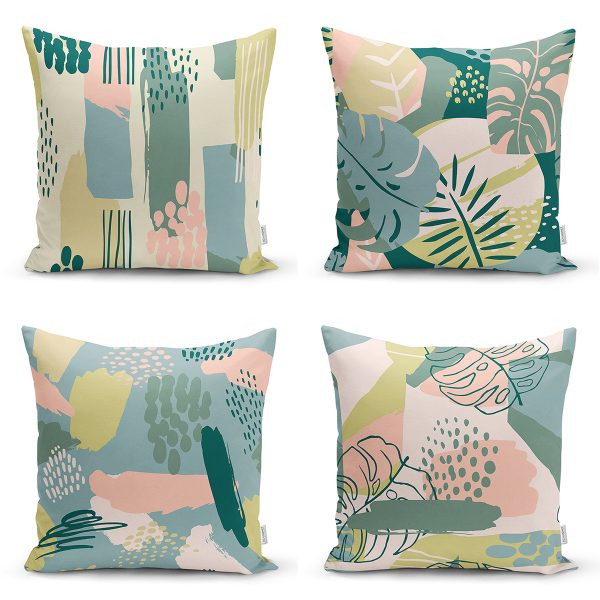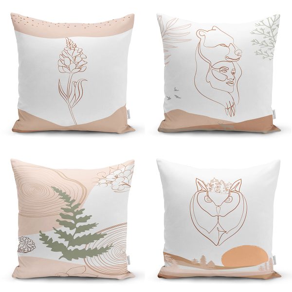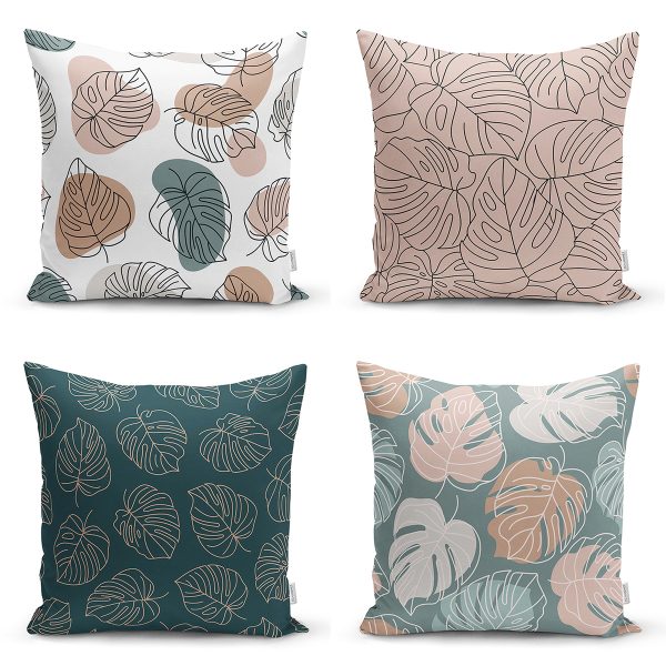 4’lü Renkli Zemin Üzerinde Onedraw Çizimli Yaprak Desenli Modern Yastık Kırlent Kılıf Seti