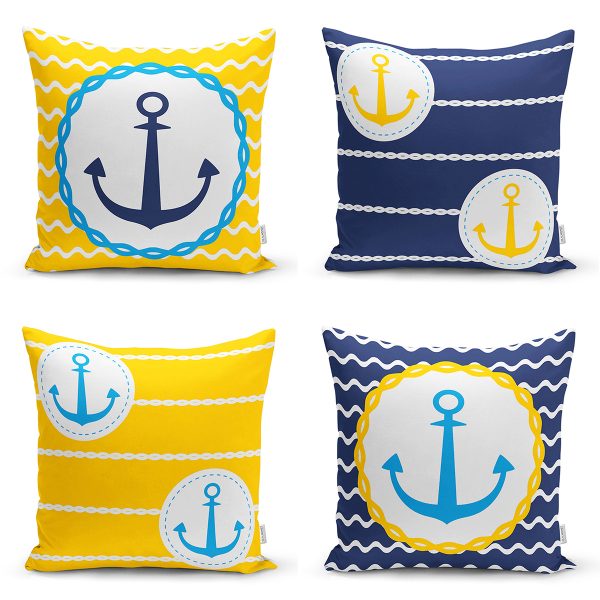 4’lü Sarı Lacivert Çapa Motifli Özel Tasarım Modern Yastık Kırlent Kılıfı Seti