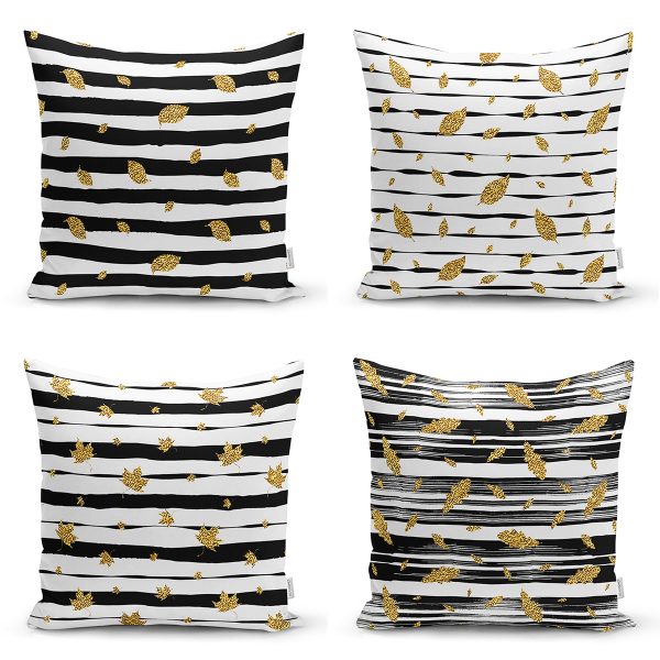4’lü Siyah Zemin Üzerinde Gold Detaylı Yaprak Desenli Modern Yastık Kırlent Kılıf Seti