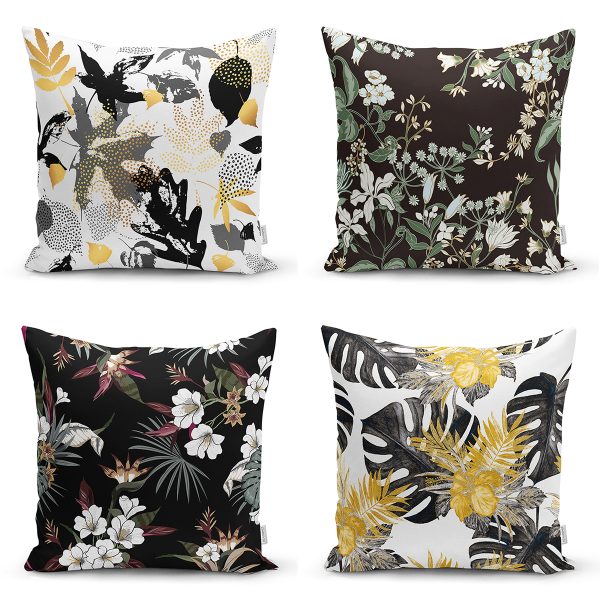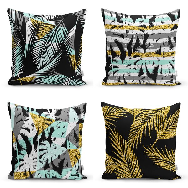 4’lü Renkli Zemin Üzerinde Gold Detaylı Yaprak Desenli Modern Yastık Kırlent Kılıf Seti