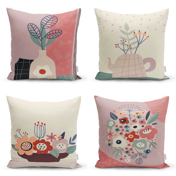4’lü Renkli Zemin Üzerinde Onedraw Çizimli Vazo Desenli Modern Yastık Kırlent Kılıf Seti