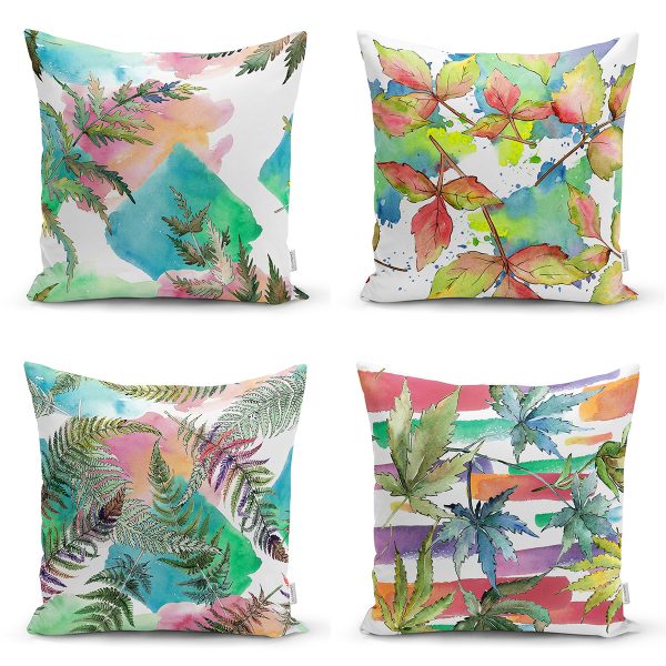 4’lü Beyaz Zemin Üzerinde Renkli Yaprak Desenli Modern Yastık Kırlent Kılıf Seti