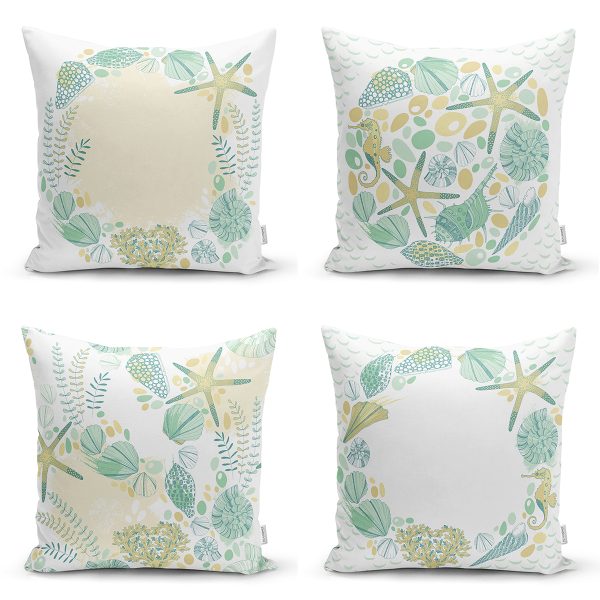 4’lü Beyaz Zemin Üzerinde Renkli Deniz Motifli Modern Yastık Kırlent Kılıf Seti