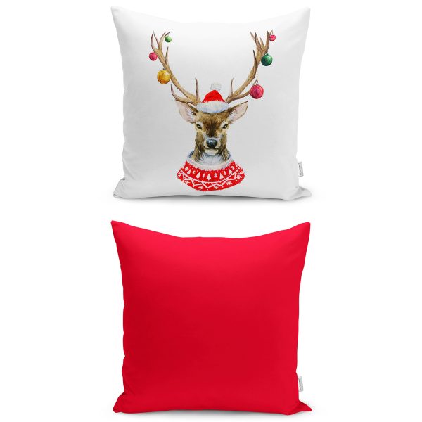 2’li Yılbaşı Temalı Geyik & Düz Kırmızı Yastık Kırlent Kılıf Seti
