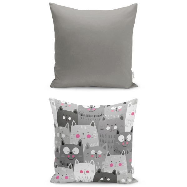 2’li Gri Kediler & Düz Gri Yastık Kırlent Kılıf Seti