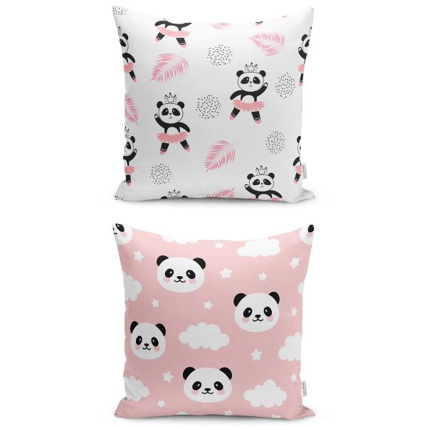 2’li Pembe Beyaz Sevimli Panda Motifli Yastık Kırlent Kılıf Seti